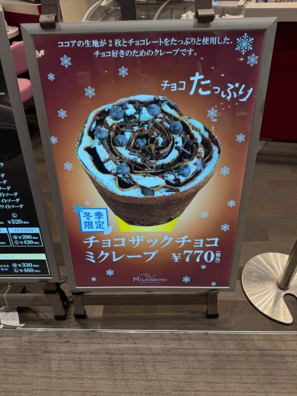 レイクタウンのような広いモールでは、食べ歩きやテイクアウトの需要も高いですよね。MILKISSIMOのジェラートやクレープは、基本的にテイクアウトしやすい形状で提供されます。